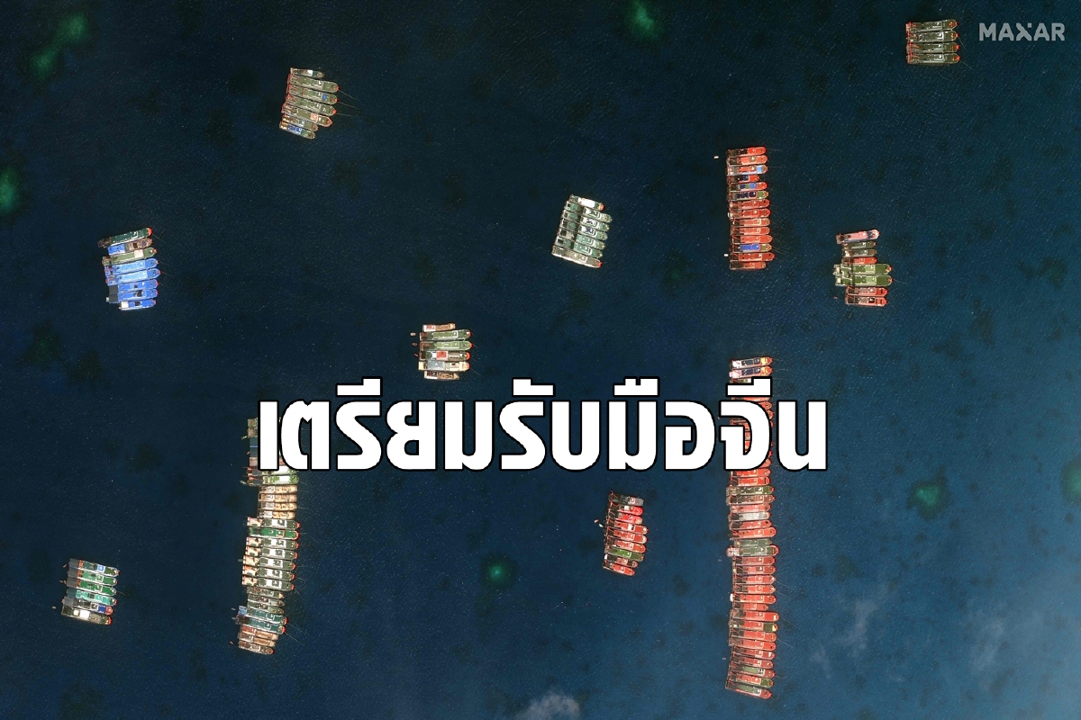 ภาพ : เรือประมงจีนที่จอดอยู่บริเวณแนวปะการังวิตซัน (Handout / Satellite image ©2021 Maxar Technologies / AFP)