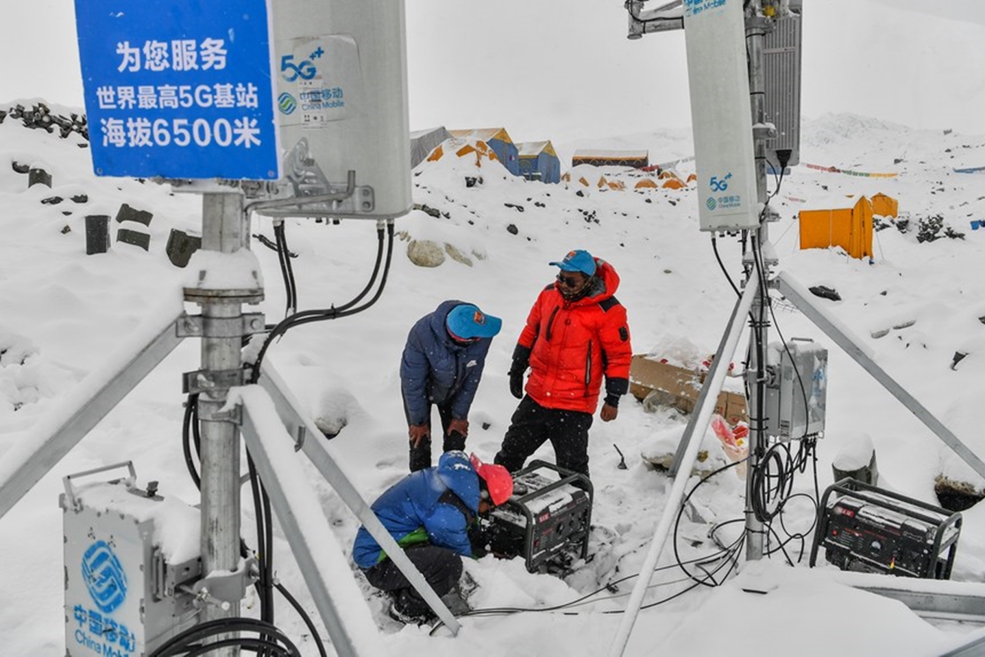 (แฟ้มภาพซินหัว : ทีมเจ้าหน้าที่ทดสอบสัญญาณของสถานีฐาน 5G บริเวณแคมป์เขาโชโมลังมา เขตปกครองตนเองทิเบตทางตะวันตกเฉียงใต้ของจีน วันที่ 21 พ.ค. 2020)