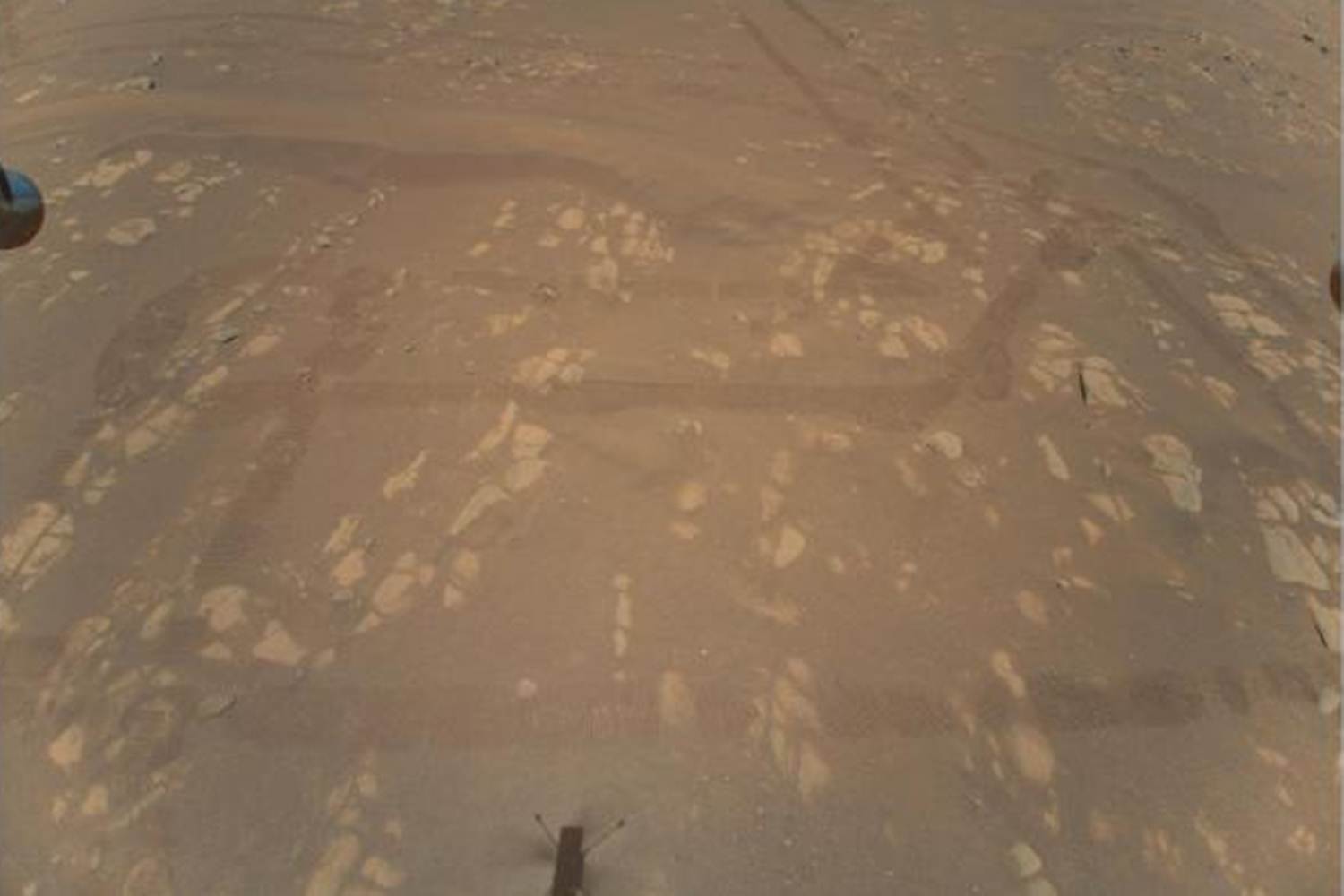 ในภาพแสดงให้เห็นพื้นผิวของดาวอังคารที่เต็มไปด้วยฝุ่น ดิน และก้อนหิน และส่วนล่างของภาพยังเห็นเงาของเฮลิคอปเตอร์ที่ทอดอยู่บนพื้นผิวดาว รวมทั้งร่องลอยล้อของยานสำรวจเพอร์เซเวียแรนซ์ (Perseverance)