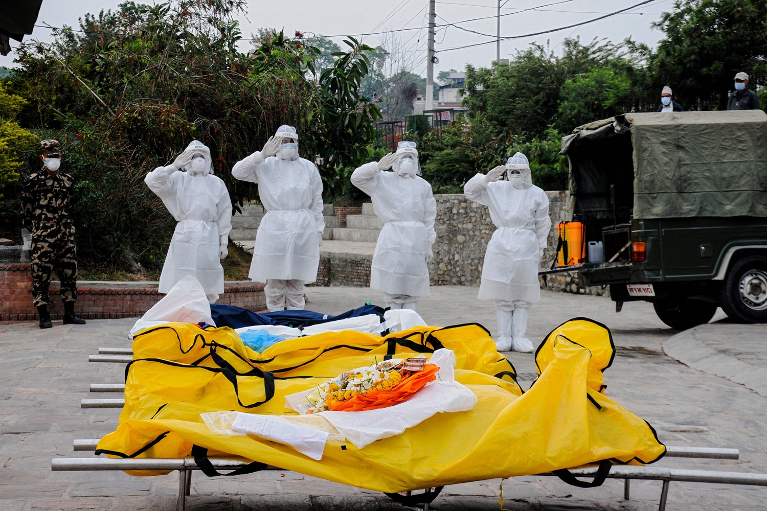 ภาพ - เจ้าหน้าที่กองทัพเนปาลสวมเครื่องป้องกัน แสดงความเคารพข้างศพเหยื่อผู้เสียชีวิตจากไวรัสโคโรนาสายพันธุ์โควิด -19 ที่เมรุไฟฟ้าในกาฐมาณฑุ เมื่อวันที่ 1 พฤษภาคม 2564 (ภาพโดย Bikash KARKI / AFP)
