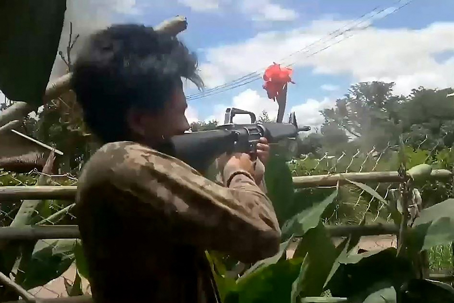 (สกรีนช็อตนี้จากวิดีโอของ UGC ที่มอบให้ AFPTV จากแหล่งที่ไม่ระบุชื่อและถ่ายเมื่อวันที่ 23 พฤษภาคม2021 แสดงให้เห็นนักรบของกองกำลังป้องกันประชาชน (PDF) ที่กำลังยิงระหว่างการปะทะกันในเมืองปาย รัฐฉาน ซึ่งเจ้าหน้าที่กองกำลังความมั่นคงของเมียนมาร์หลายสิบนายถูกสังหาร สถานีตำรวจถูกฝ่ายต่อต้านยึด จากข้อมูลของฝ่ายต่อต้าน- Photo by Handout / various sources / AFP)
