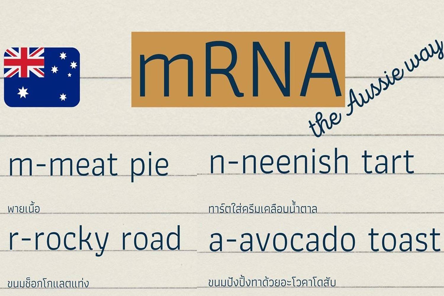 โดยเมื่อวันที่ 14 ก.ค. เฟซบุ๊กอย่างเป็นทางการของสถานทูตออสเตรเลียประจำประเทศไทยโพสต์ข้อความระบุว่า "แต่ละคนอาจจะเข้าใจคำย่อต่างกันไป นี่คือสิ่งที่เพจเราเข้าใจว่า mRNA ย่อมาจากอะไร และนั่นคืออาหารและขนมอันเป็นที่รักของคน #ออสเตรเลีย โดย