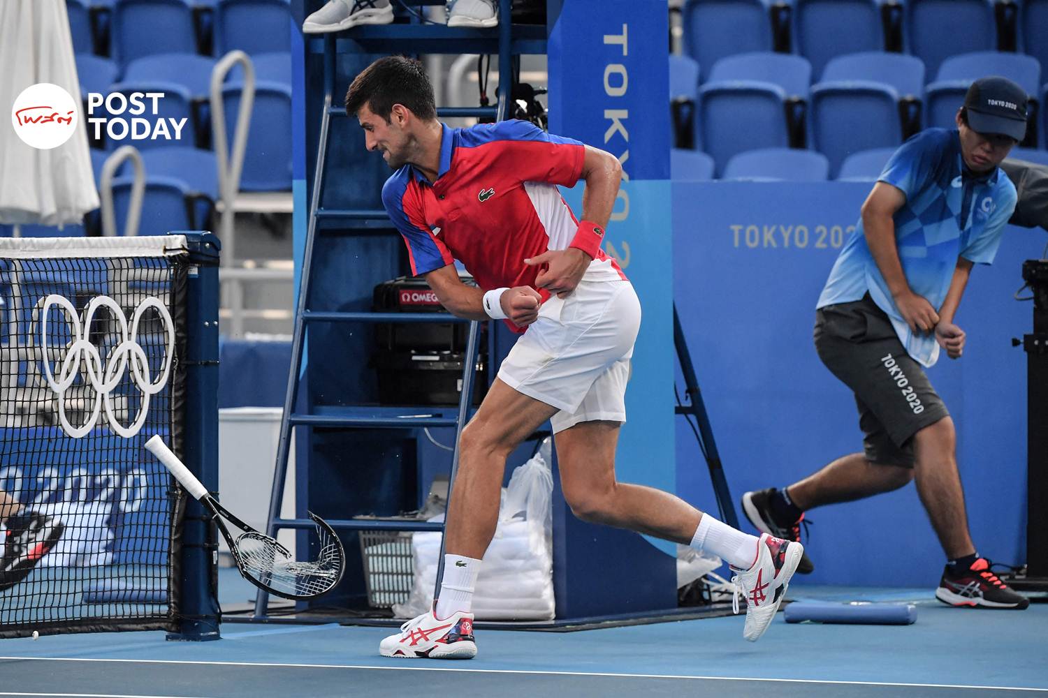 ภาพปก: โนวัค ยอโควิช นักเทนนิสชื่อดังชาวเซอร์เบียขว้างแร็กเก็ตระหว่างหวดชิงเหรียญทองแดงเทนนิสชายเดี่ยวกับ ปาโบล การ์เรโญ บุสตา จากสเปน 1 ต่อ 2 เซ็ต (Photo by Tiziana FABI / AFP)