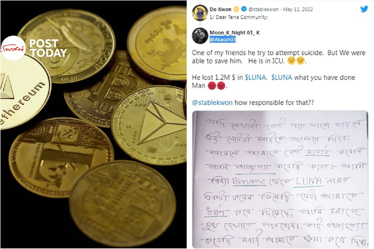 เจ้าของบัญชีทวิตเตอร์ @Akassh03 เจ้าไปโพสต์เรื่องราวของเพื่อนใต้ทวีตของ โด ควอน ผู้ก่อตั้ง Terraform Labs ซึ่งเป็นเจ้าของเหรียญ LUNA ว่า “เพื่อนผมคนนึงพยายามฆ่าตัวตาย แต่พวกเราช่วยเขาไว้ได้ทัน เขาอยู่ในห้องไอซียู เขาเสียเงินไป กับ $LUNA 1.2 ล้านเหรียญสหรัฐ $LUNA คุณทำอะไรลงไปเนี่ย” พร้อมกับโพสต์ภาพที่คาดว่าน่าจะเป็นจดหมายลาตาย