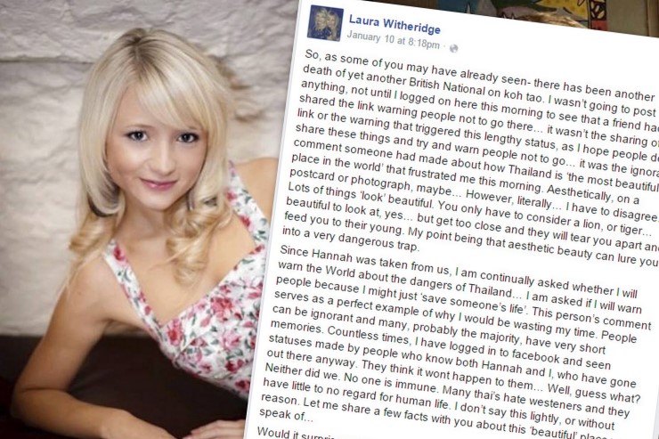 กลายเป็นประเด็นขึ้นมาอีกครั้ง เมื่อล่าสุด 10 ม.ค. 'ลอรา วิทเธอร์ริดจ์'พี่สาวของ'ฮันนาห์ วิทเธอร์ริดจ์'นักท่องเที่ยวสาวชาวอังกฤษซึ่งเสียชีวิตจากการถูกฆาตกรรมที่เกาะเต่า เมื่อเดือน ก.ย. 2557 ได้โพสต์ข้อความระบายความในใจถึงเมืองไทยที่ใครๆ ก็ต่างคิดว่าเป็นหนึ่งในสถานที่ท่องเที่ยวที่สวยที่สุดในโลก จนกระทั่งสื่อดังอย่าง'บีบีซี'นำมาตีแผ่ โดยมีใจความว่า