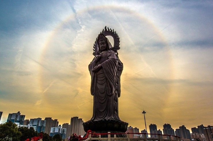 งดงาม!สื่อจีนเผยภาพถ่ายอาทิตย์ทรงกลดหลังองค์เจ้าแม่กวนอิม คนแห่ไหว้