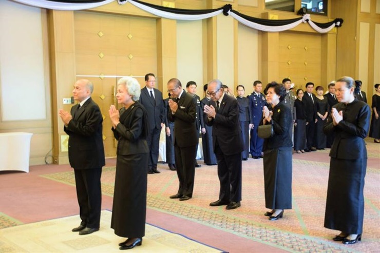 บรรยายภาพ - พระบาทสมเด็จพระบรมนาถ นโรดม สีหมุนี ทรงถวายสักการะพระบรมฉายาลักษณ์ พระบาทสมเด็จพระปรมินทรมหาภูมิพลอดุลยเดช ณ กรุงพนมเปญ